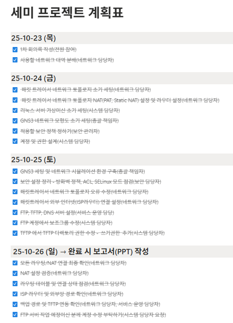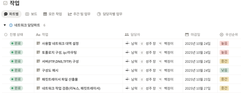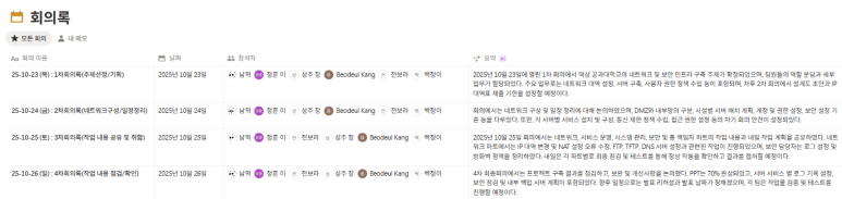전체 일정 관리,회의록 작성, 작업 로그 수집·정리, 네트워크/서버/보안 파트 조율을 담당했습니다.